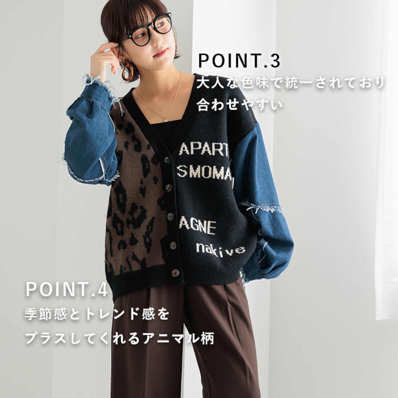 ニットカーディガン レディース トップス カーディガン Vネック 長袖 ヒョウ柄 アニマル柄 ロゴ デニム ブラウン チャコール クロ 羽織 大人カジュアル 高見え 肌触り 定番デザイン 上質 体型カバー 着やせ 着回し 大人の定番 華奢見え ママコーデ