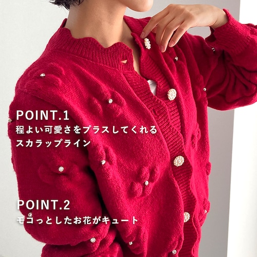 ニットカーディガン レディース トップス 花柄 花 ぷっくり 長袖 ニット ビジュー スカラップ 大人可愛い ふんわりニット カーディガン 大人カジュアル 高見え 肌触り 定番デザイン 上質 体型カバー 着やせ 着回し 大人の定番 華奢見え ママコーデ