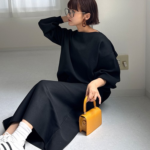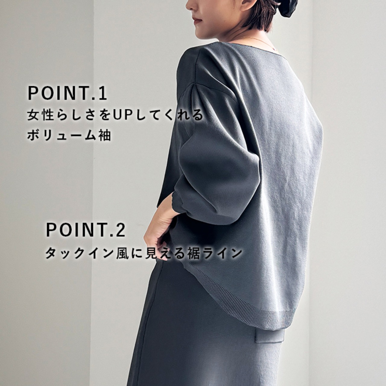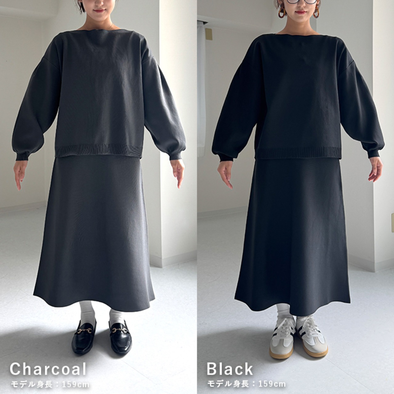 セットアップ レディース ニット ボートネック 前後2way 無地 薄手 ボリューム袖 長袖 10分袖 フレアスカート ロングスカート ウエストゴム マタニティ 産後コーデ 大人カジュアル 高見え 肌触り 定番デザイン 上質 体型カバー 着やせ 着回し 大人の定番 華奢見え ママコーデ