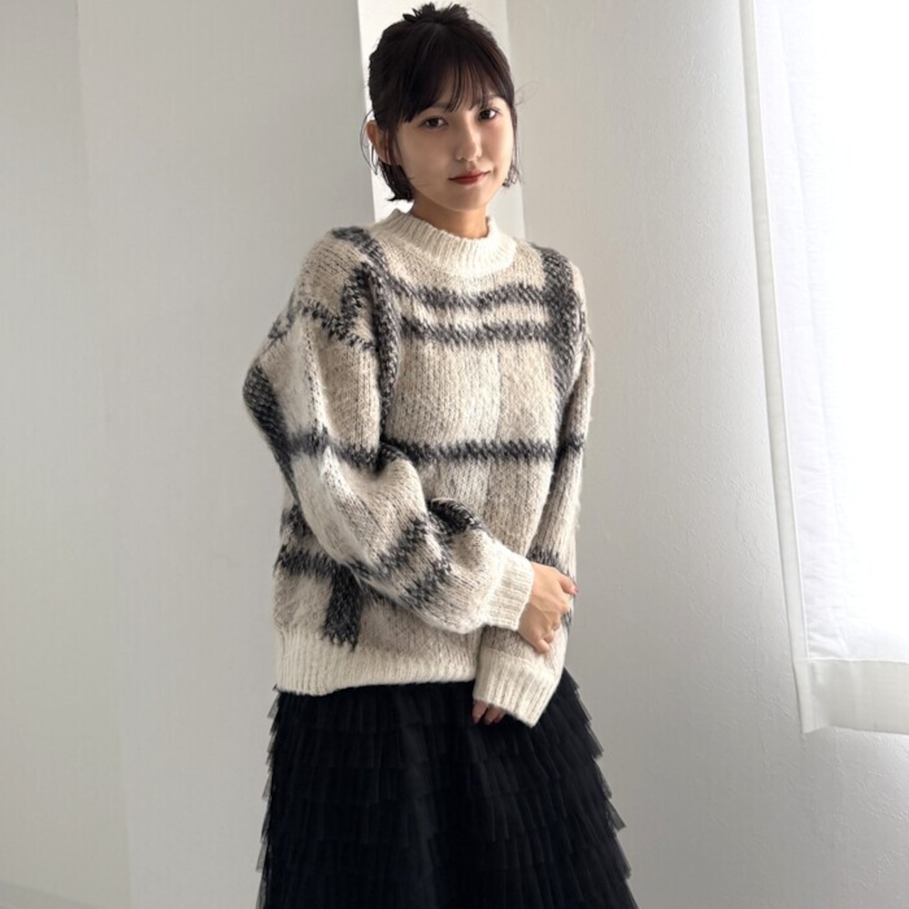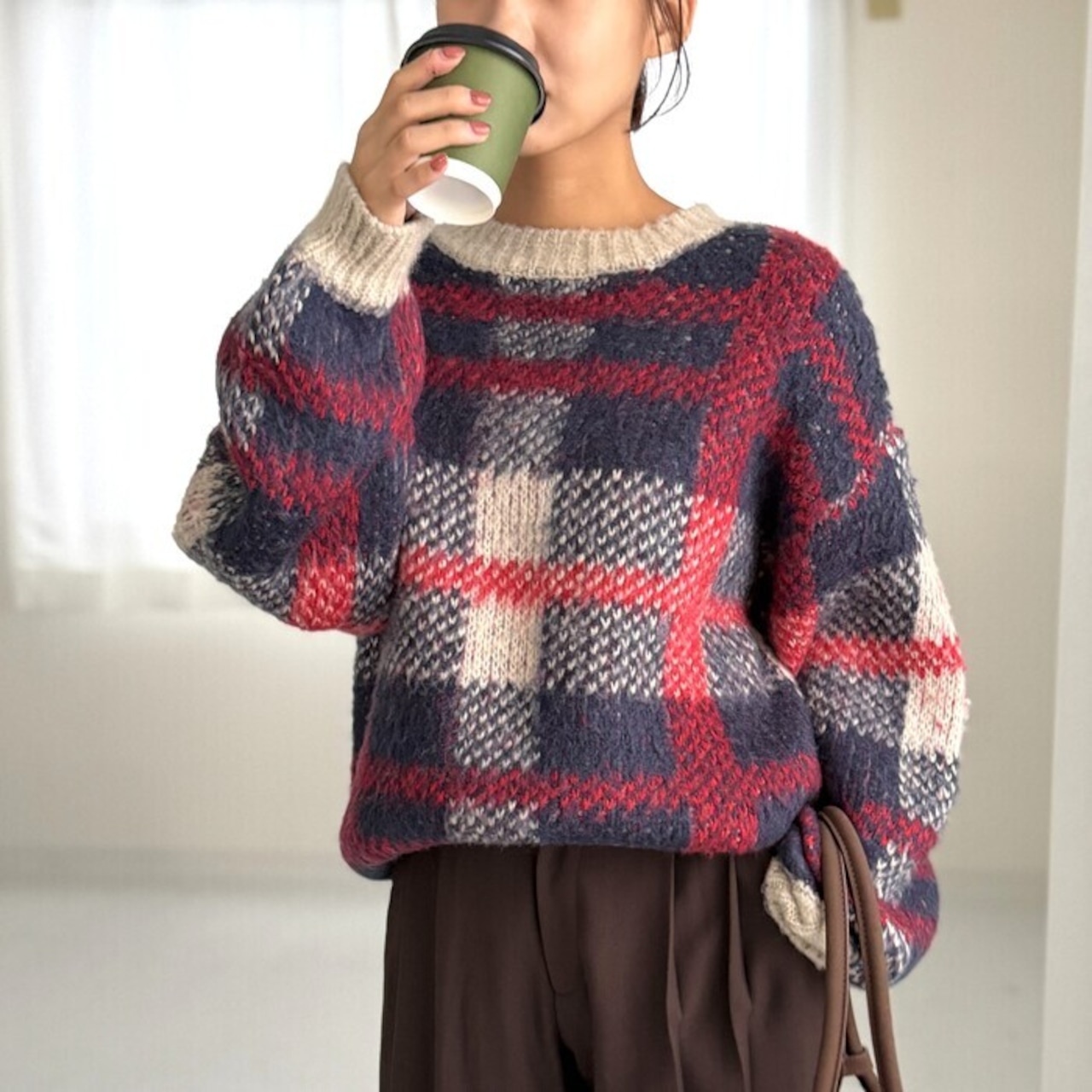 大柄チェック地のニットは